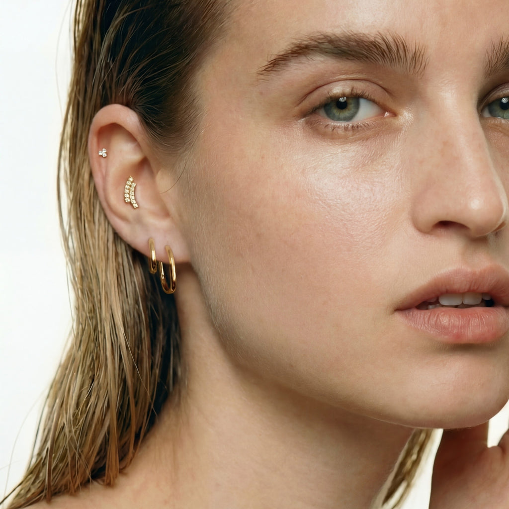 Explore the Covetear range of 14k gold piercing jewellery — available in white and yellow 14k solid gold. Carefully crafted with specific hypoallergenic blends of nickel-free alloys. Covetear fashion-forward designs allow you to create curated looks instantly. You don’t have to wait until your piercing heals to wear something you like. Covetear jewellery is sustainably made from Fairtrade 14K gold and recycled 14K gold. Covetear uses sustainable and traceable luxury materials – featuring lab grown, conflict-free, ethically sourced gemstones and diamonds. Covetear manufacturers are certified by the Responsible Jewellery Council. The RJC provides the most comprehensive international framework for compliance and focuses on best practices in OH&S, human rights, fair labour, governance and environmental protection. Covetear earrings are high-quality implant grade and certified piercing jewellery, which can be used in new piercings at your local piercing studio. Covetear offers internally threaded piercing jewellery and specialised piercing jewellery. Implant grade jewellery is jewellery that is biocompatible and safe for long-term implantation into the body. Covetear fine jewellery is nickel-free and tarnish-resistant, designed for long-term wear in ear cartilage piercings. We have flat-back post designs for cartilage piercings to ensure optimal healing and wearability. Featuring a range of letter studs, classic studs, deco studs, alphabet studs, cross studs, heart studs, lightening studs, flat disc studs, round studs, diamond