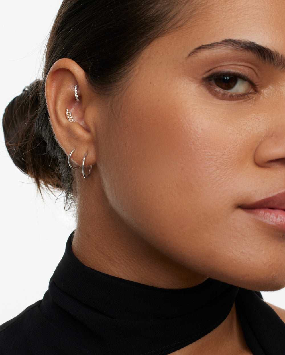 Available in Left and Right settings, this piece sits perfectly in the defined curves of the ear. This modern classic is the ultimate blend of luxury and sustainability Hypoallergenic and suitable for new and healed piercings.