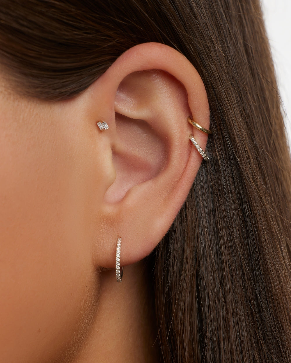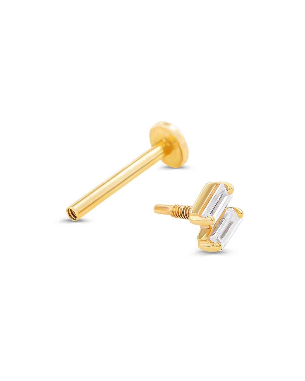 The Bebe Baguette Duo Earring is a simple statement for your ear. This cartilage earring features two precision cut baguette diamonds encased in an envelope setting.